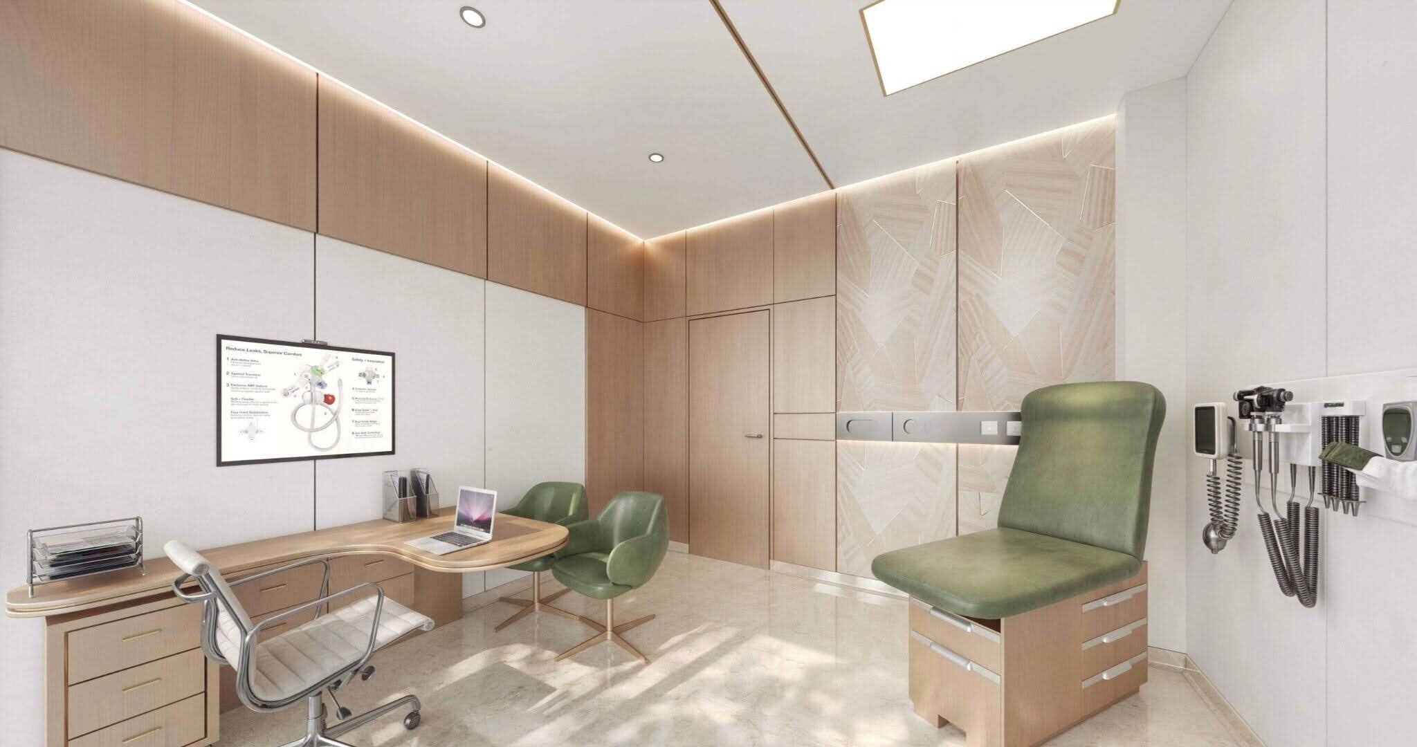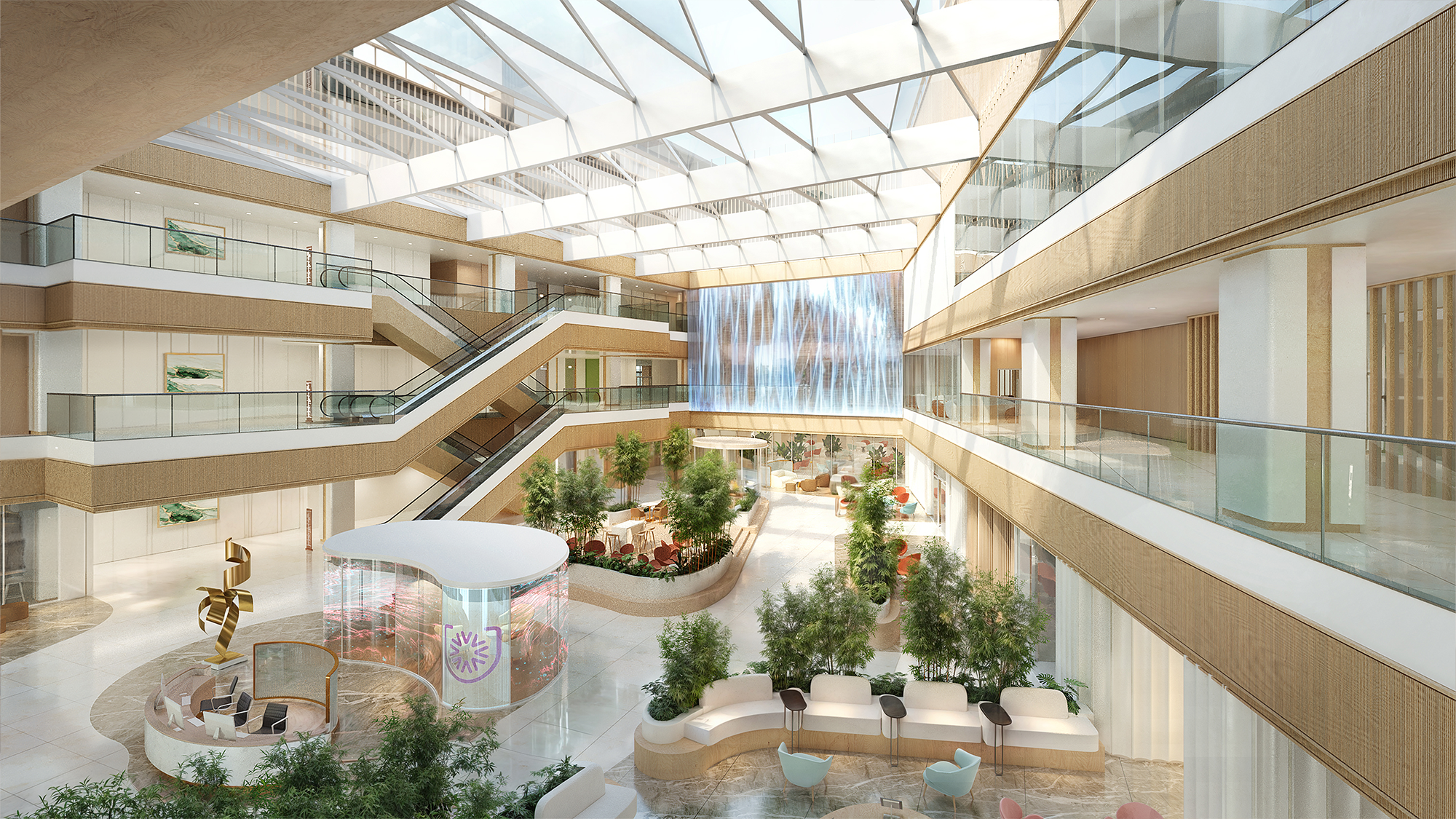 The building features a diamond-patterned façade that resembles a jewel box, establishing it as a radiant landmark signifying the value of health and well-being. Interior spaces are infused with biophilic elements, featuring natural materiality and local stones that symbolize strength and renewal.